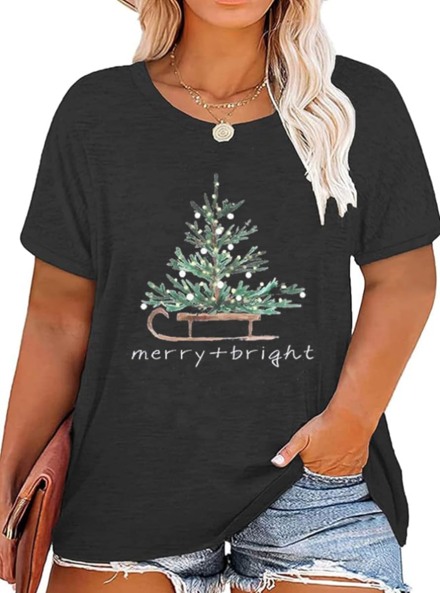 Plus Size Christmas Tree Tshirt Womens Merry Christmas Graphic tee Merry and Bright Short Sleeve
