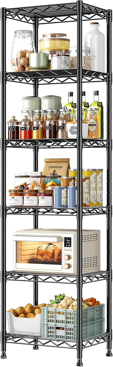 - Practical Multi-Scene Design: With compact dimensions of 15.8"w*11.8"D*63"H,this Metal Shelving Unit adapts seamlessly to narrow spaces like corners or beside cabinets. Its adjustable mesh panels allow flexible height customization, perfect for Small place use as Pantry Shelves in kitchens, bathrooms for toiletries, Embedded Space,or even bookshelves in studies, meeting diverse home storage needs.