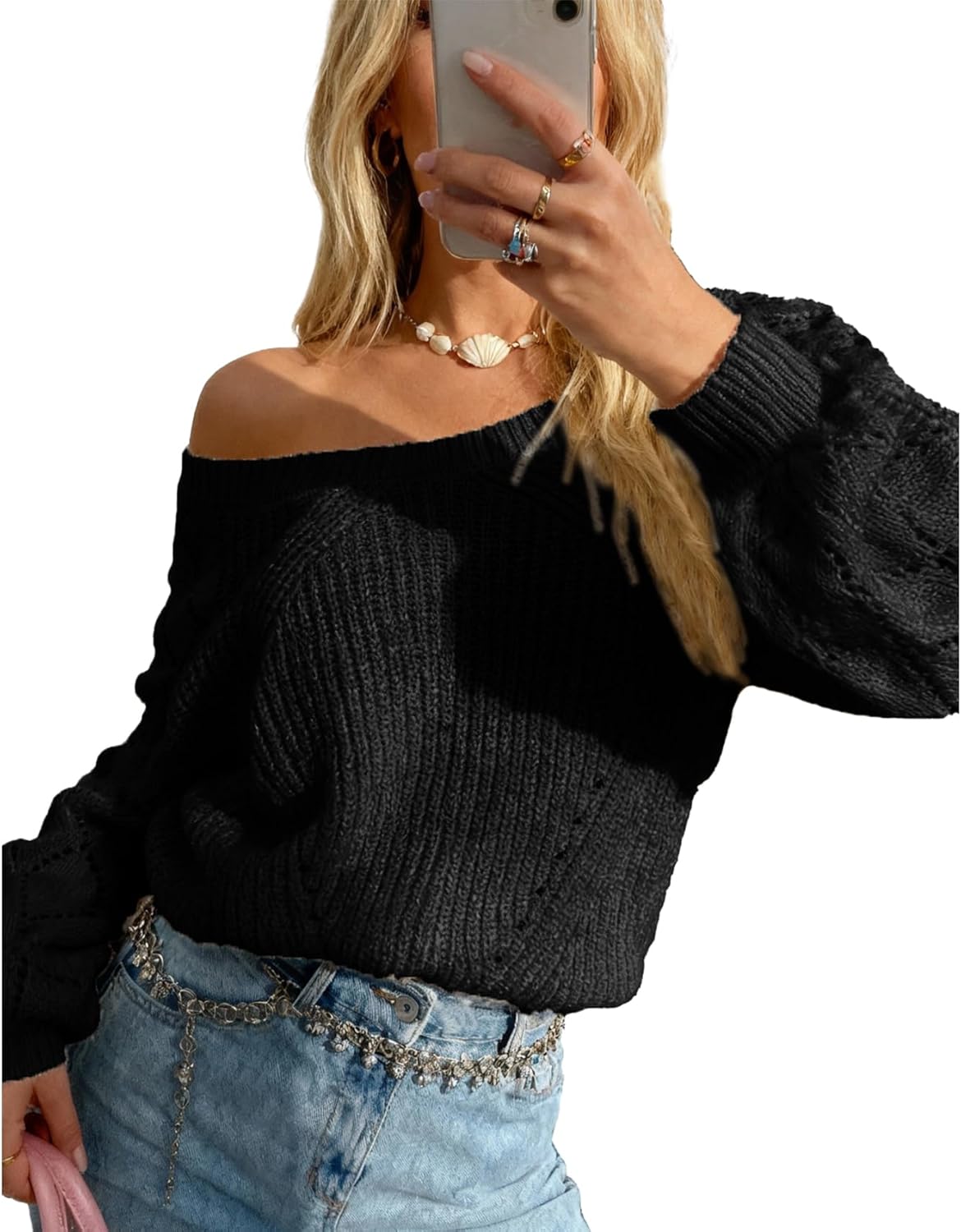 Women's Sweater Crochet Hollow Knit Sweater Crew Neck Lantern Sleeve Pullover Lightweight Tops