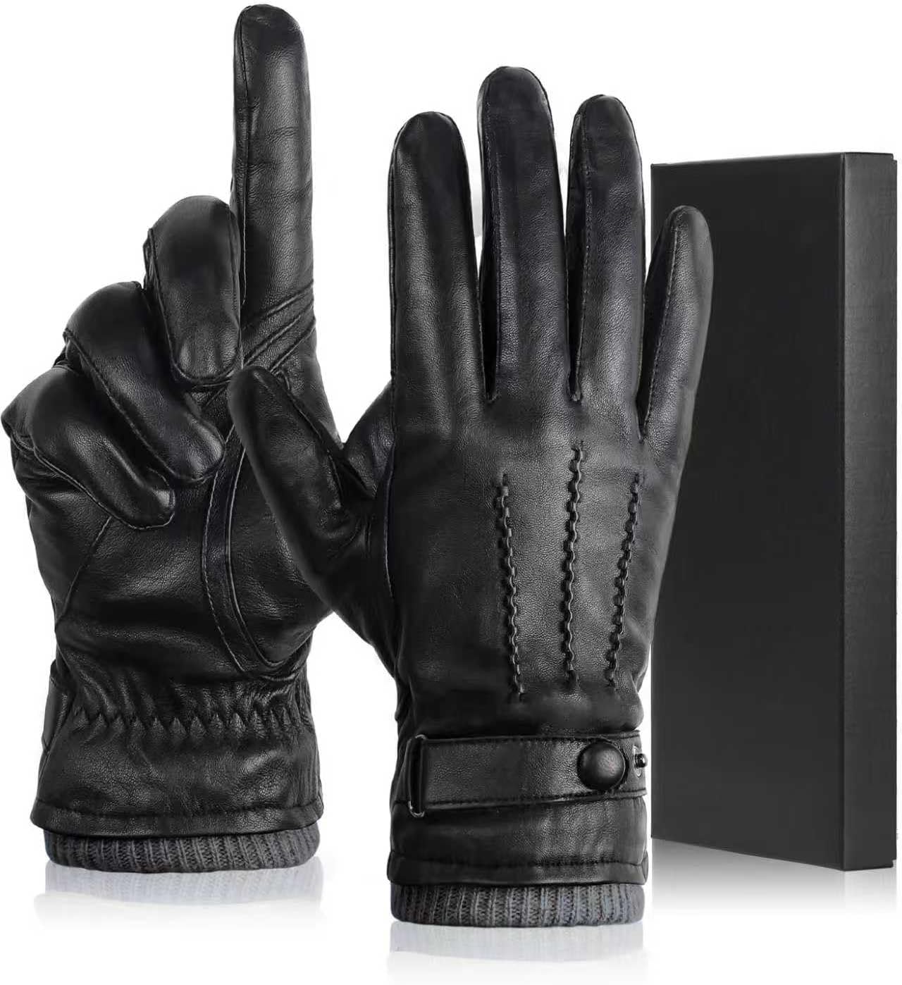 Winter Genuine Sheepskin Leather Gloves for Men, Warm Cashmere Lined Black Leather Touchscreen Motorcycle Gloves