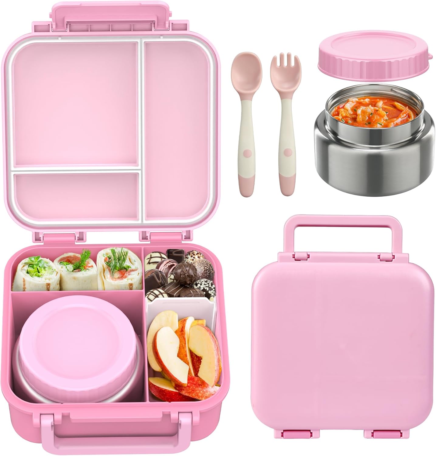 Bento Box for Kids with Soup Thermos(9oz)– Kid Bento Lunch Box with Leak Proof Insulated Food Jar, Hot & Cold Lunch Container Set for School Girls Boys, 4-Compartments, Dishwasher Safe, Pink