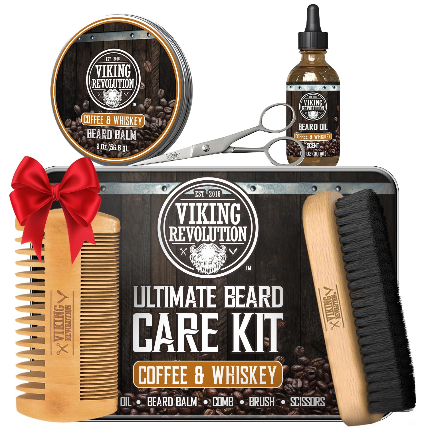 - Perfect Holiday Gift For Men - Viking Revolution Beard Kit for men is what your man needs to look smoking hot this holiday! This Ultimate Beard Care Kit contains Wooden Boars Hair Beard Brush, Double Sided Pocket Beard Comb, Coffee & Whiskey Beard Oil, Coffee & Whiskey Scent Beard Styling Balm, and Beard Scissors in a sleek and stylish metal tin.