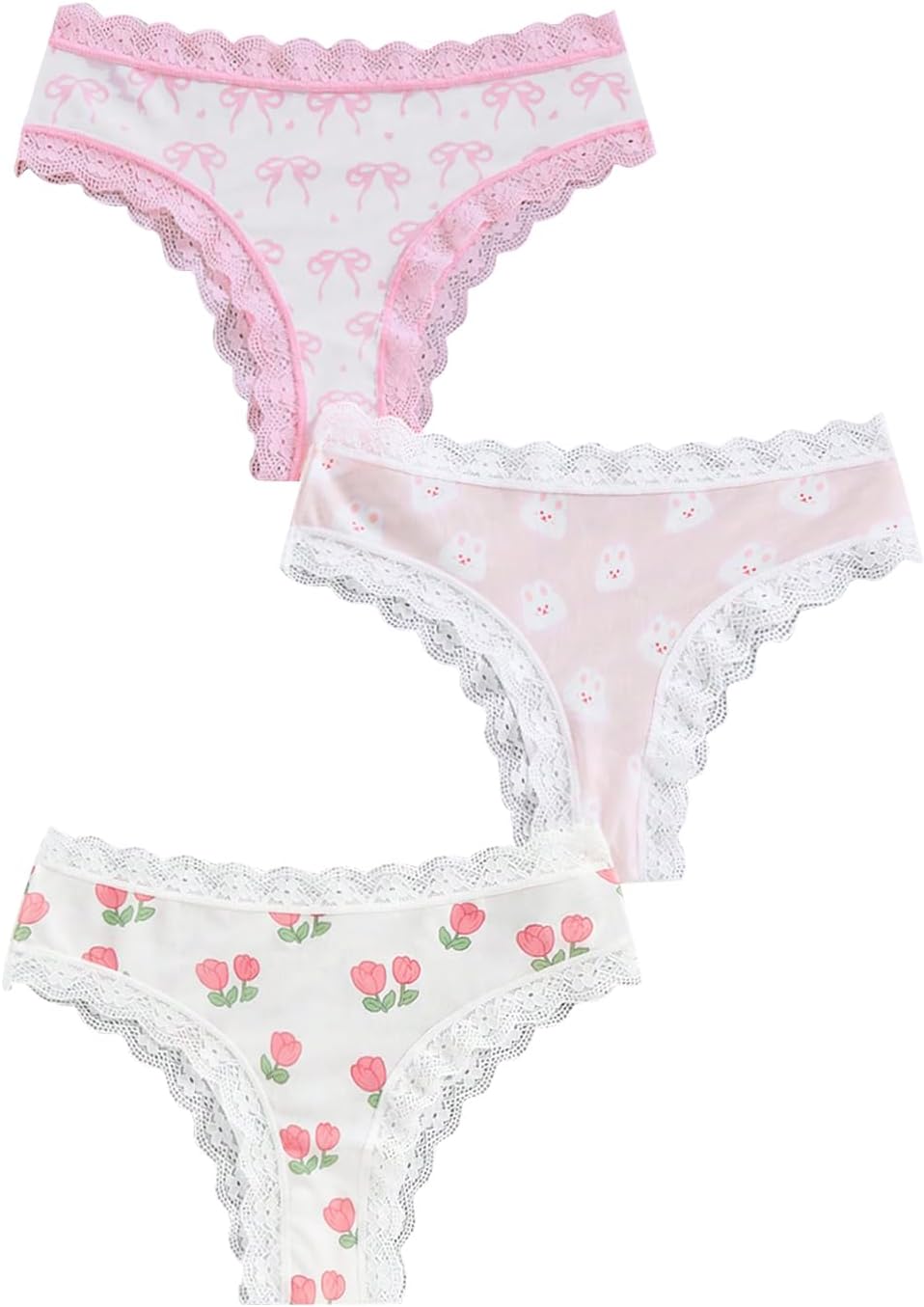 WDIRARA Women's 3 Pack Cute Graphic Panties Set Lace Trim Low Rise Comfy Thong Underwear