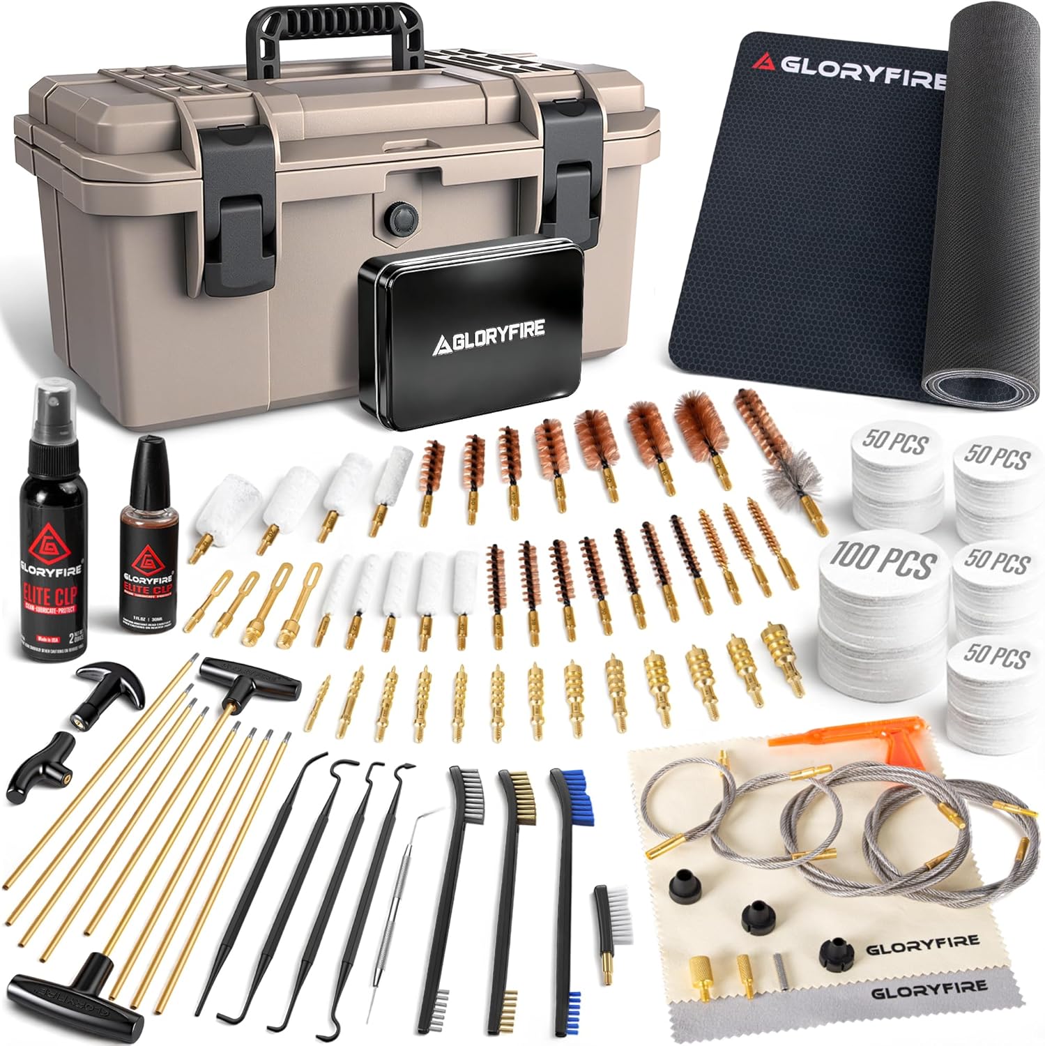 GLORYFIRE Deluxe Universal Gun Cleaning Kit - Highly Effective Cleaning Solutions for Hunting and Shooting - Portable/Compact - Brown