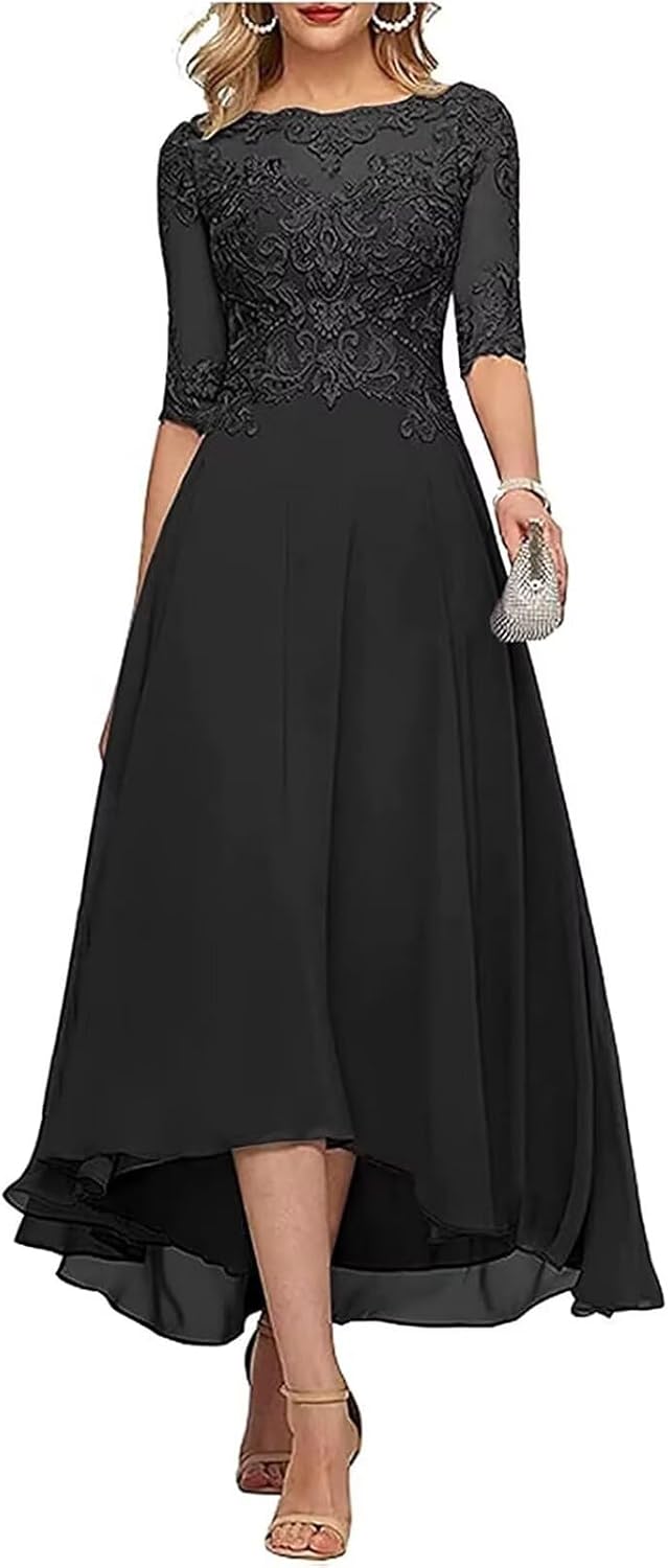 ALEESHUO Tea Length Chiffon Mother of The Bride Dresses with Half Sleeve Lace Applique Formal Dress for Wedding FLP109