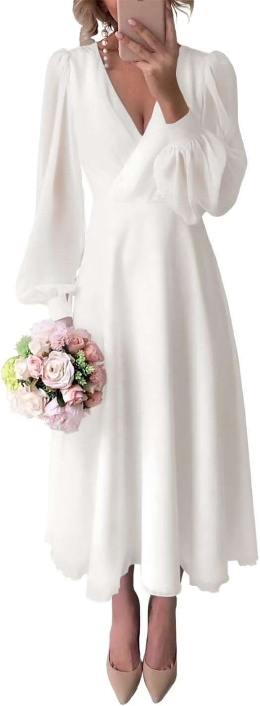 Long Sleeves Tea Length Wedding Dress for Bride Chiffon V Neck Midi Long Bridal Dress for Women