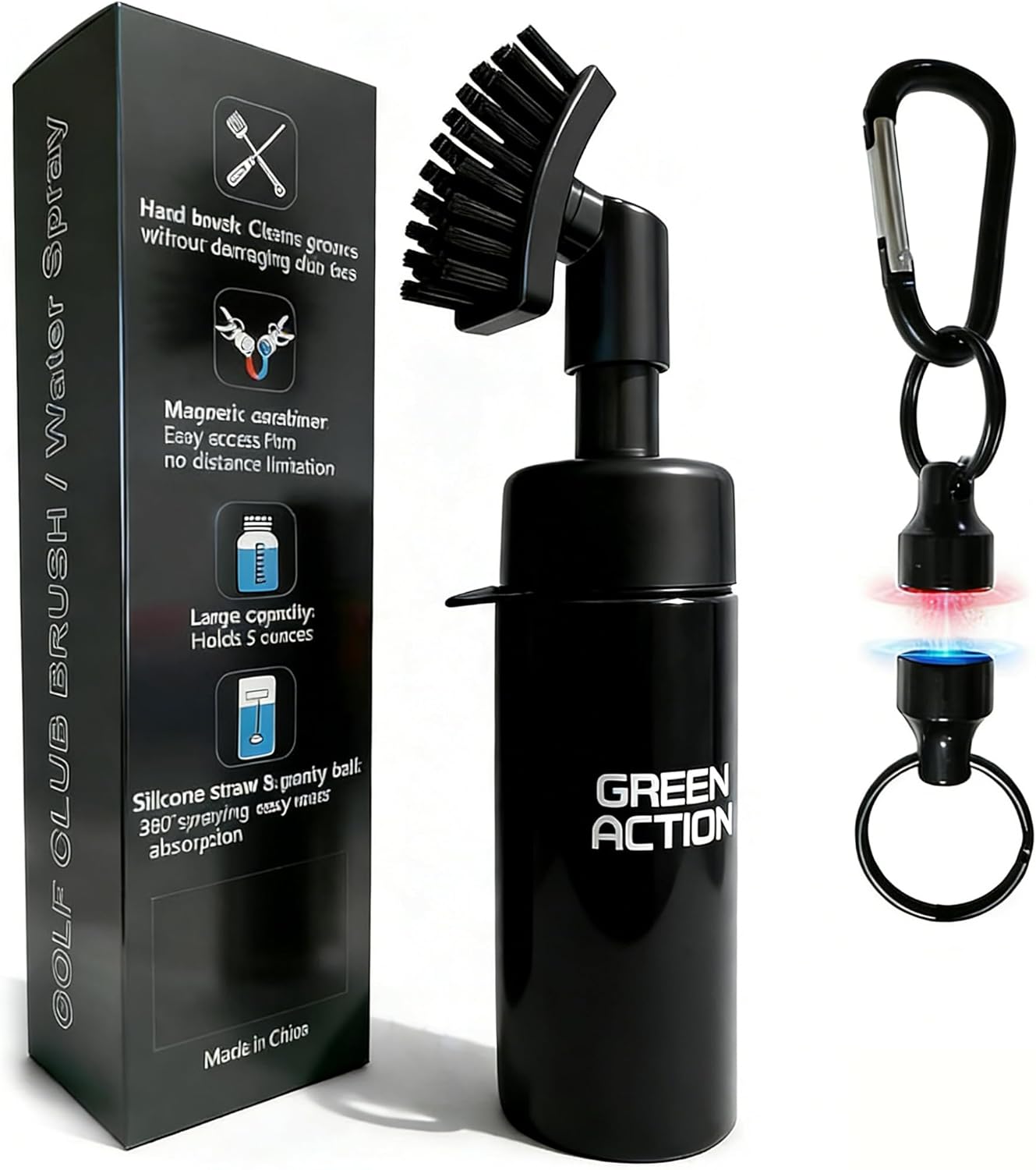 - 【Unique Design Golf Club Cleaner 】 The GREEN ACTION brush comes with an 8.5-inch squeeze water bottle that holds 5 ounces of water, providing enough for multiple cleaning sessions without frequent refills. It features a built-in silicone hose and a gravity ball, ensuring the hose delivers a steady spray at any angle, even when the brush is tilted.