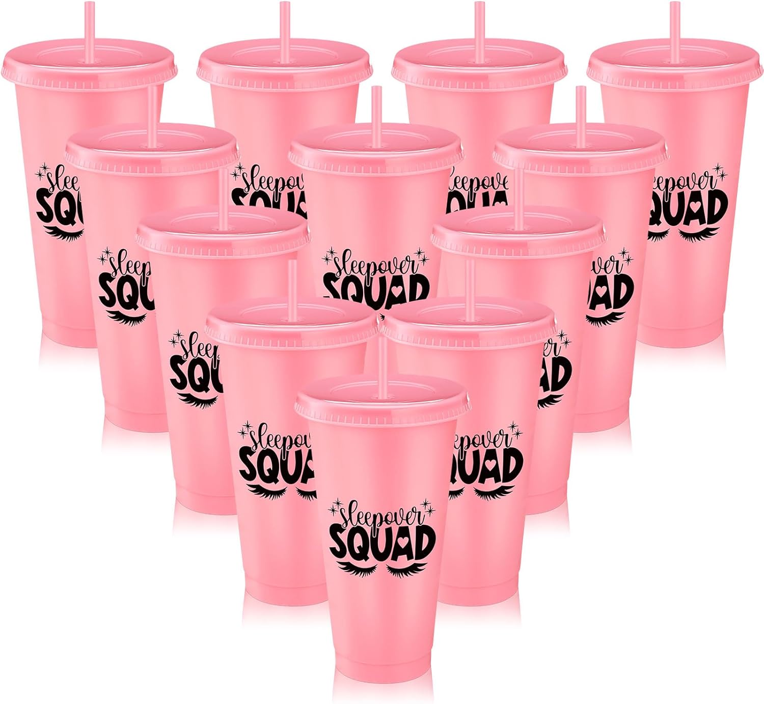 - Stylish Sleepover Party Celebration Essential: complete your sleepover party with style with our birthday cups; Our package offers 12 pink plastic tumblers, printed with "Sleepover Squad" words; Bursting with vibrant color and bold prints, these cups not only serve your favorite beverages but also help to set the mood for a lively and festive celebration