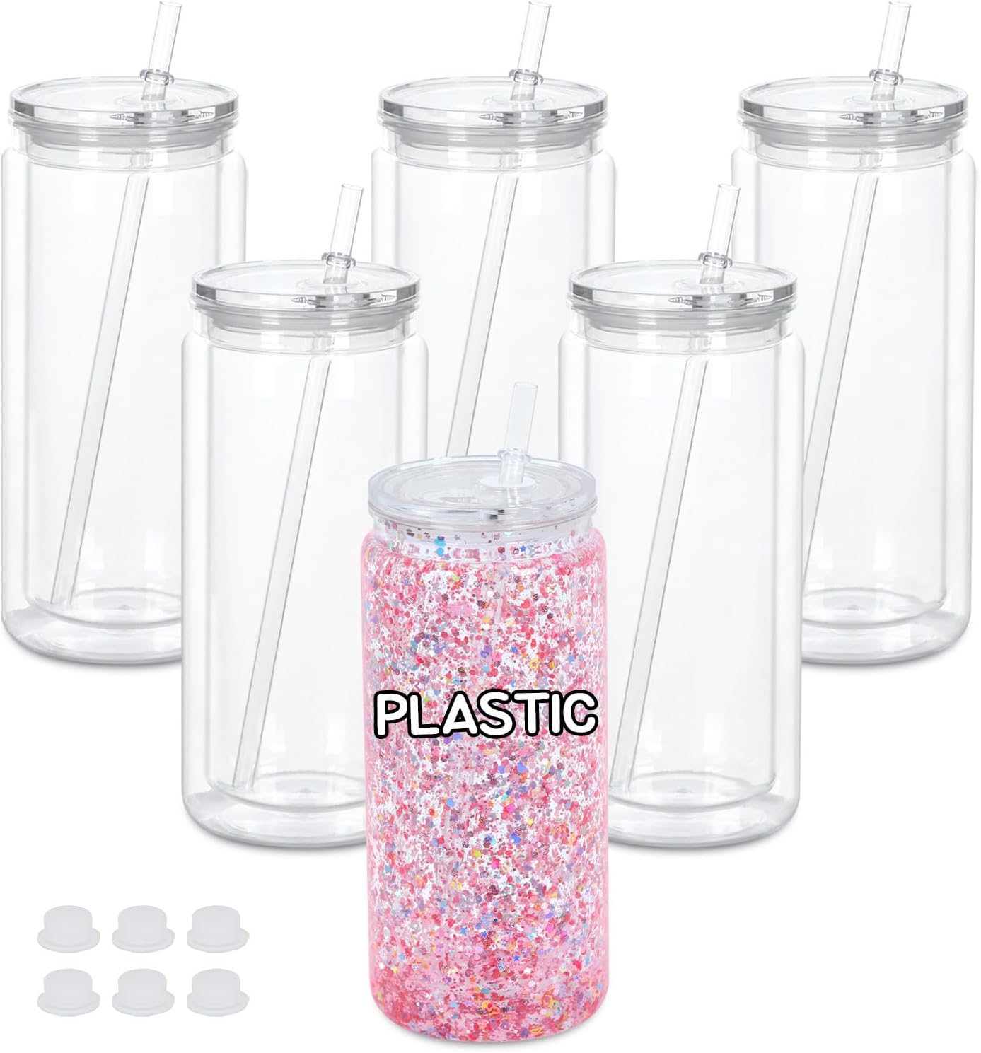 20 Oz Plastic Snowglobe Tumbler, 6 Pack Pre-Drilled Double Wall Acrylic Snow Globe Cup, Plastic Clear Cup for Snowglobe, with Clear Lid