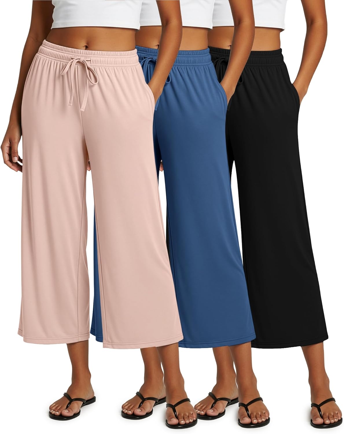 Real Essentials 3 Pack: Women's Ultra-Soft Wide Leg Loose Capri Open Bottom Pants - Yoga Lounge Pockets(Available in Plus)