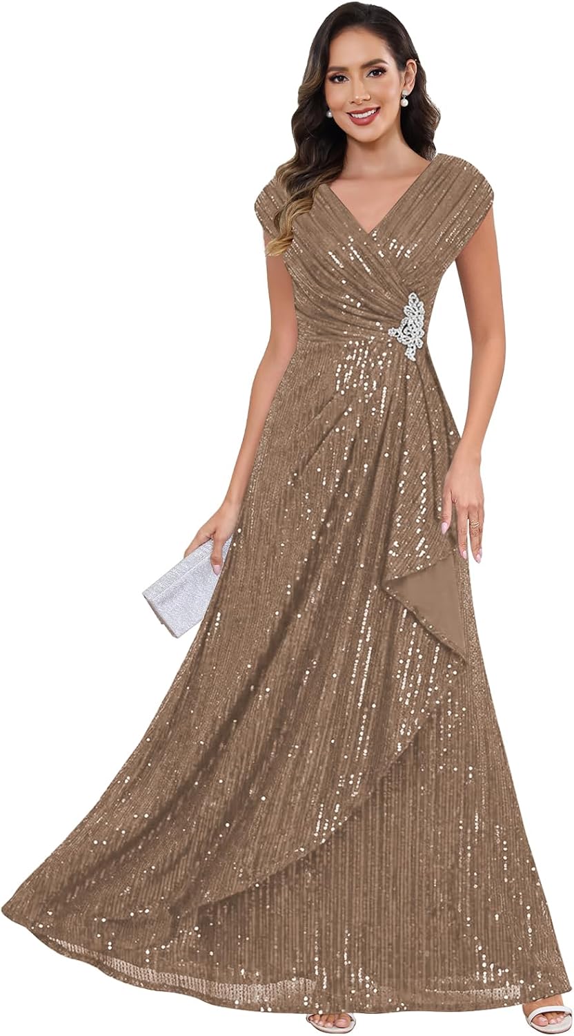 Sequin Mother of The Bride Dresses with Cape Sleeves V Neck A Line Pleated Long Formal Evening Gown