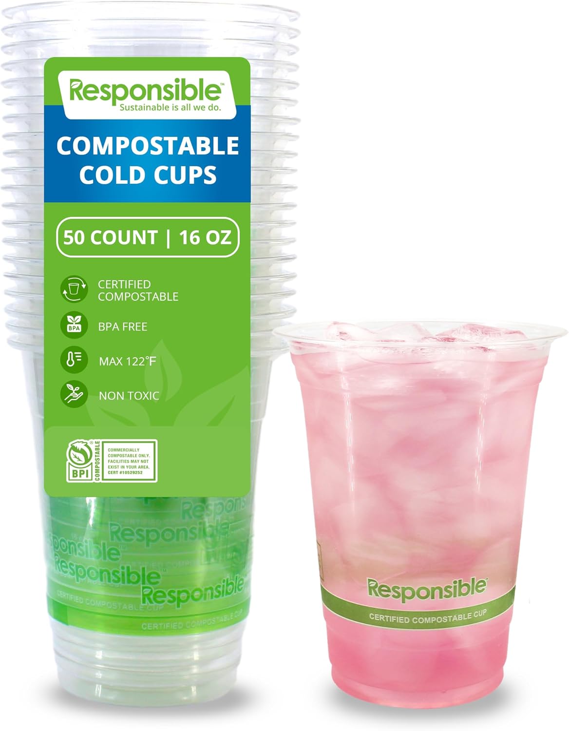 Responsible Products Clear Cold Cup, Certified Compostable and Made from 100% American Biobased Materials, No-PFAS Added & BPA-Free (16 oz Cups (50 Count))