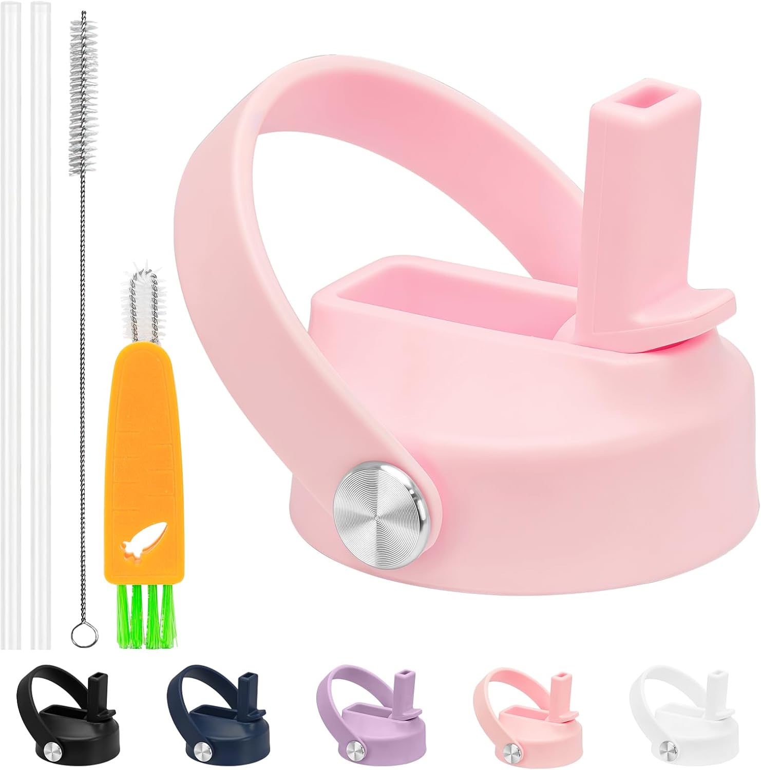 Straw Lid for Hydro Flask Wide Mouth,Lids with Straw for Hydroflask 12 16 18 20 32 40 oz Wide Mouth,Leak-Proof Drinking Cap with Flexible Handle,Top Sport Bottle Lids with Lid Brush,Pink