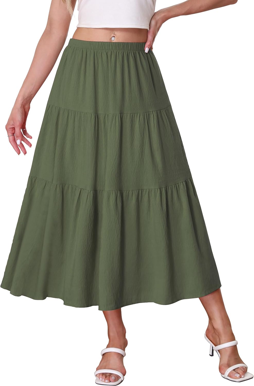 Kingfancy Women's Boho Midi Skirt A-Line Ruffle Elastic High Waist Tiered Flowy Skirts