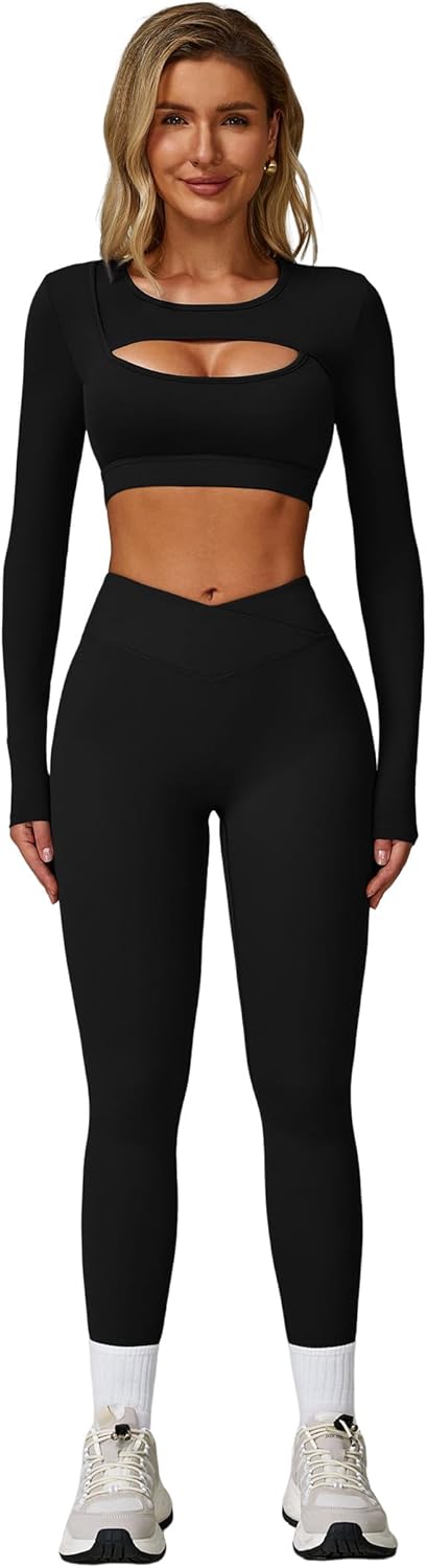 2 Piece Workout Sets for Women Seamless High Waist Flare Leggings Yoga Long Sleeve Cutout Crop Tops Athletic Sets