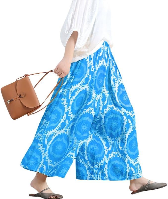 CHOUYATOU Women's Loose Floral Printed Cotton Crop Pants Elastic Waist Wide Leg Palazzo Trousers