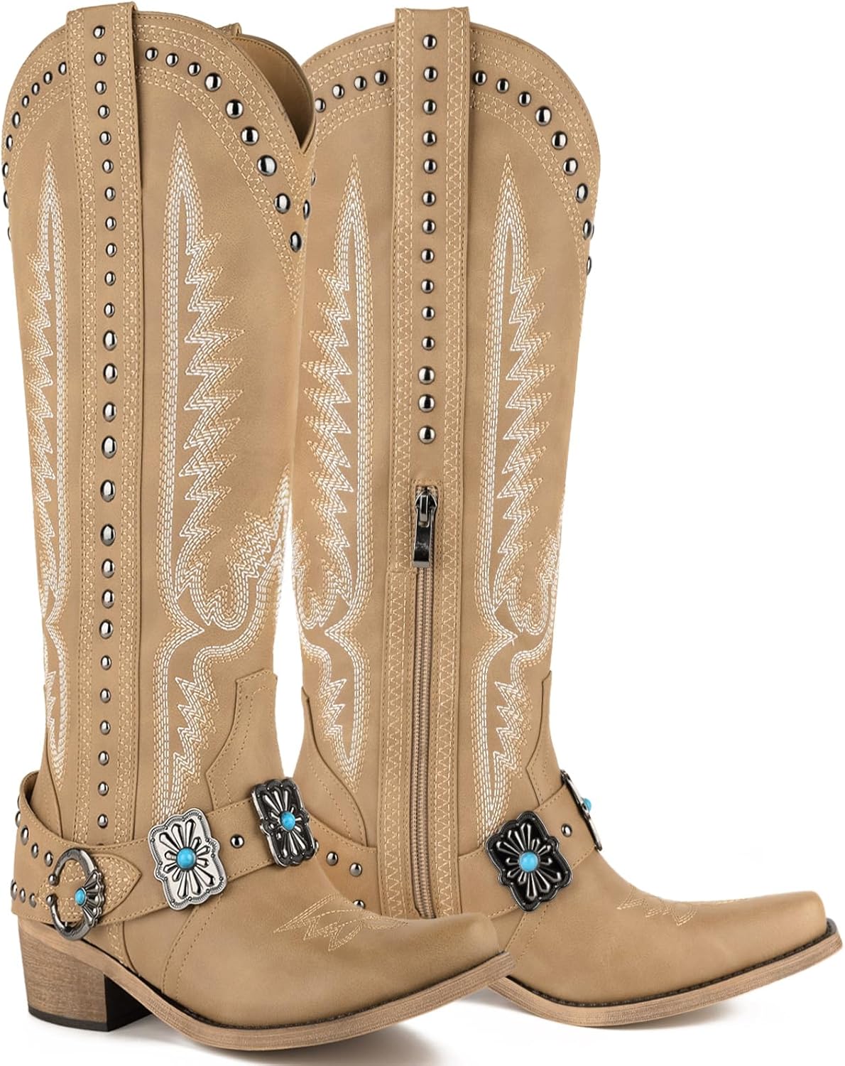 Yolkomo Cowboy Boots for Women Knee High Western Cowgirl Boots with Embroidery Belt Buckle Chains