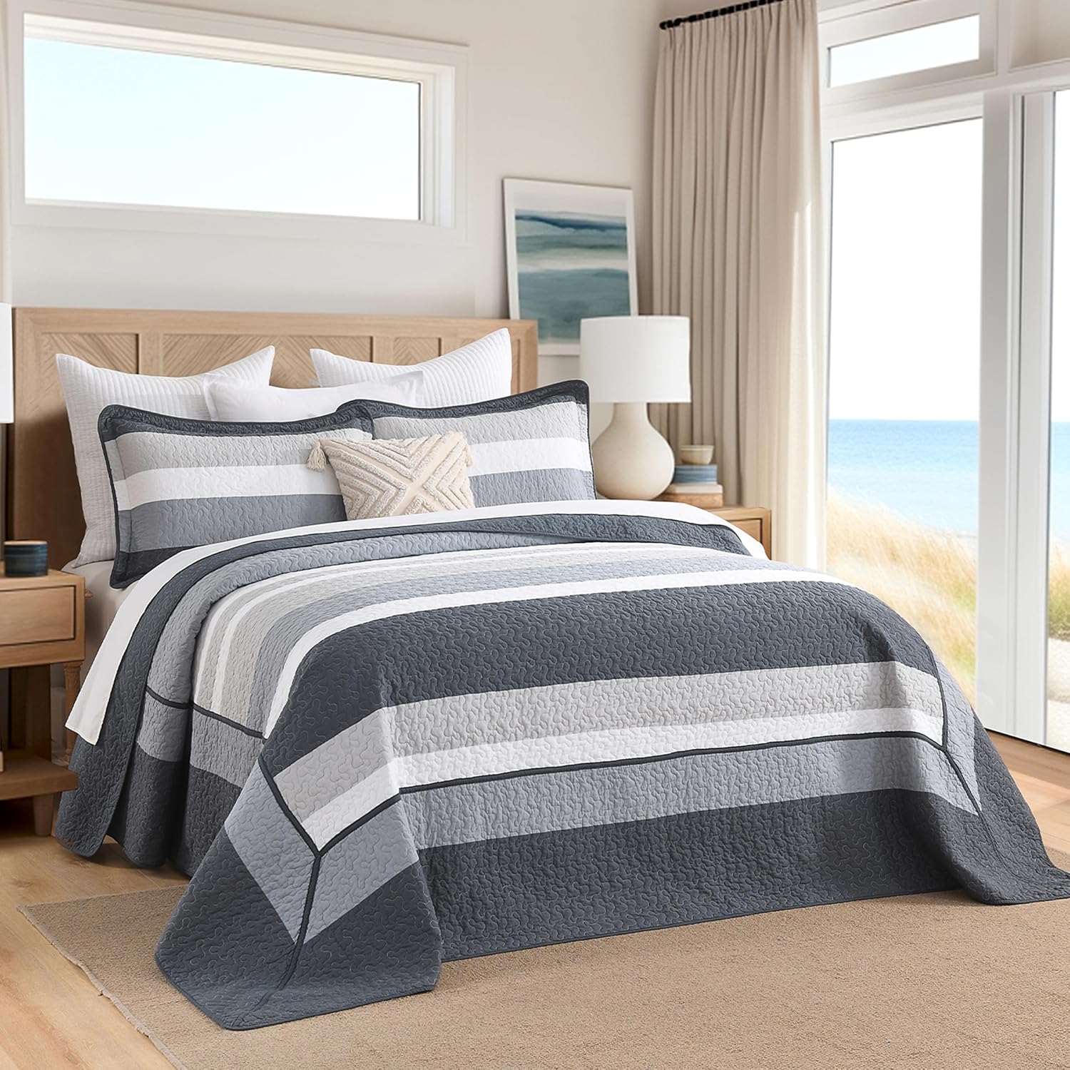 - Elegant Design: This bedspread showcases a modern and rustic design with a contemporary casual flair. The pattern features wide - horizontal stripes in a harmonious blend of dark gray, light gray, and white. The quilted texture enhances its tactile appeal, creating a cozy yet stylish look. This versatile color palette and design make it suitable for various bedroom decors, whether aiming for a modern aesthetic or a rustic - inspired retreat.