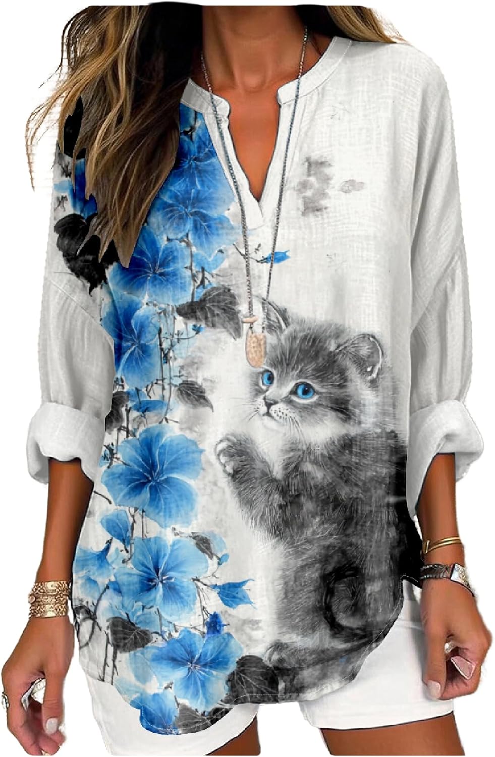 MARSVOVO Cat Shirts for Women Long Sleeve Cute Cat Pullover Graphic Novelty V Neck Blouse Oversized Funny Tunic Tops