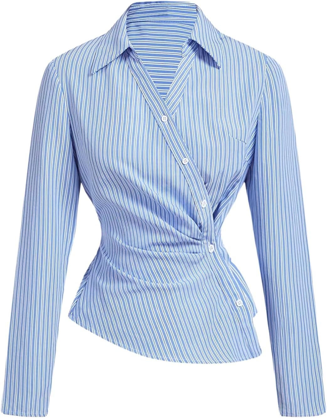 SweatyRocks Women's Striped Button Down Blouse Long Sleeve Ruched Wrap Asymmetrical Shirts