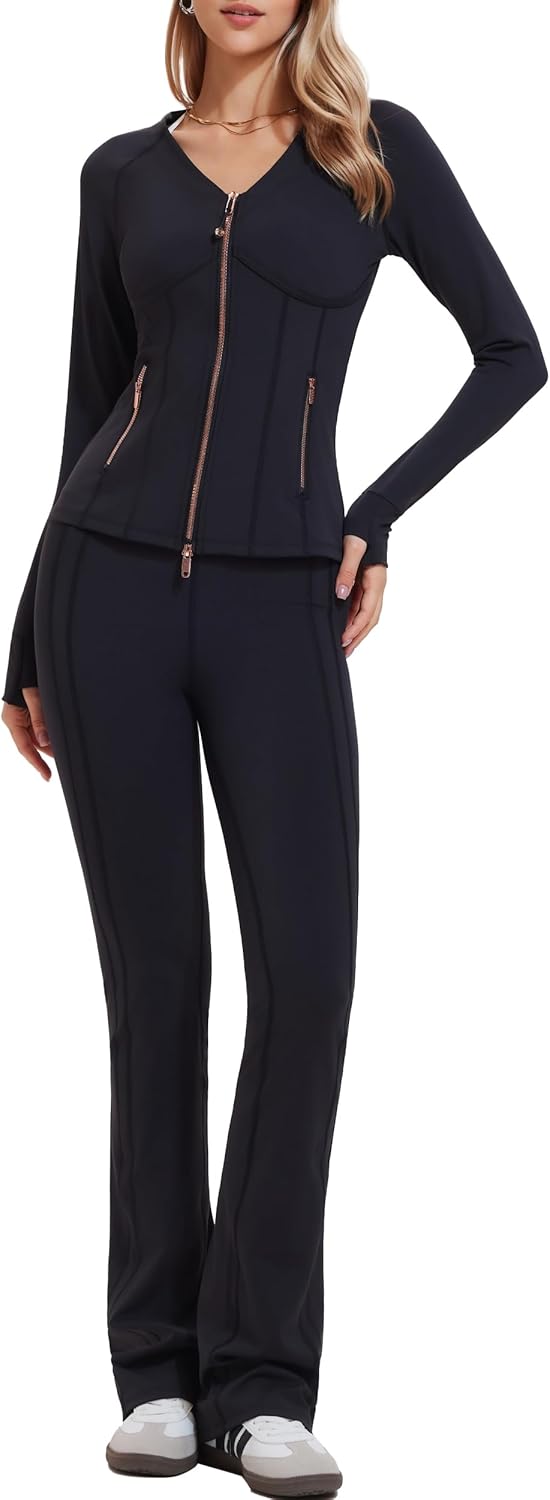 Mudere Womens 2 Piece Workout Set with Zip Up Long Sleeve Jacket High Waisted Flare Leggings Yoga Outfits
