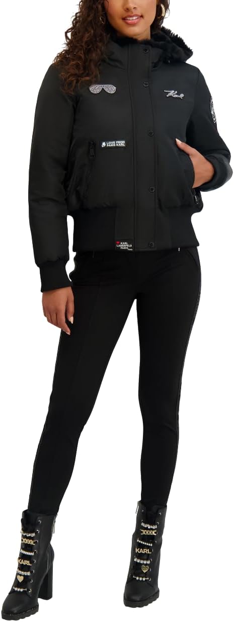 KARL LAGERFELD Paris Women's Water Resistant Cropped Patch Bomber Black, Medium