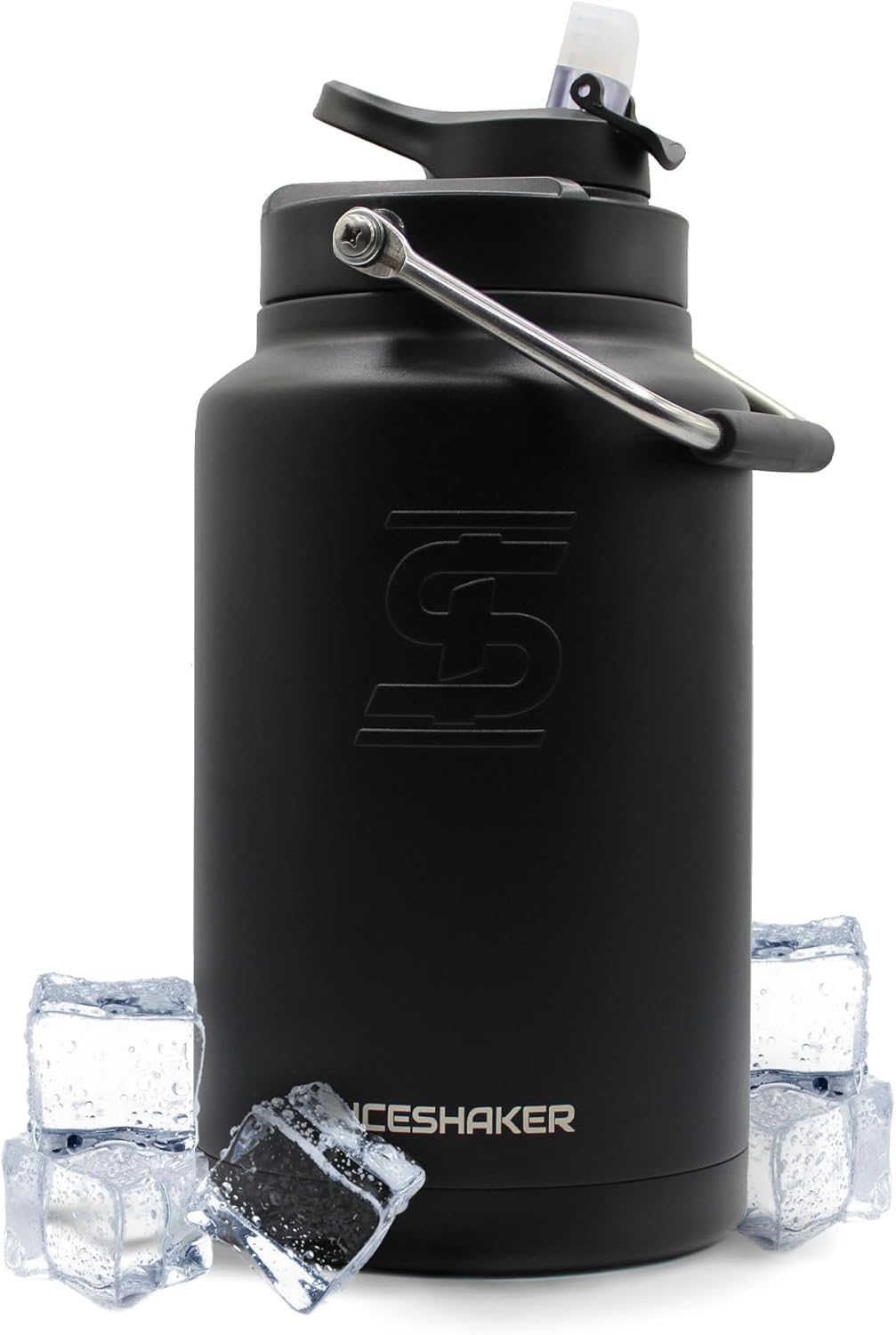 Ice Shaker Insulated Stainless Steel Gallon Water Jug | 128 Oz, Black | Stays Cold for 60+ Hours | Multi-purpose lid | Odor-Free Outdoor Water Jug for Sports, Camping, Hiking, Working Out