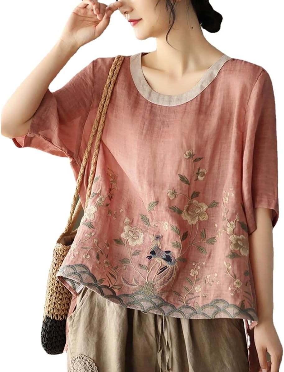 Chinese Retro Shirt, Heavy Industry Embroidered Linen Shirt, Color Blocking Round Neck Pullover T-Shirt
