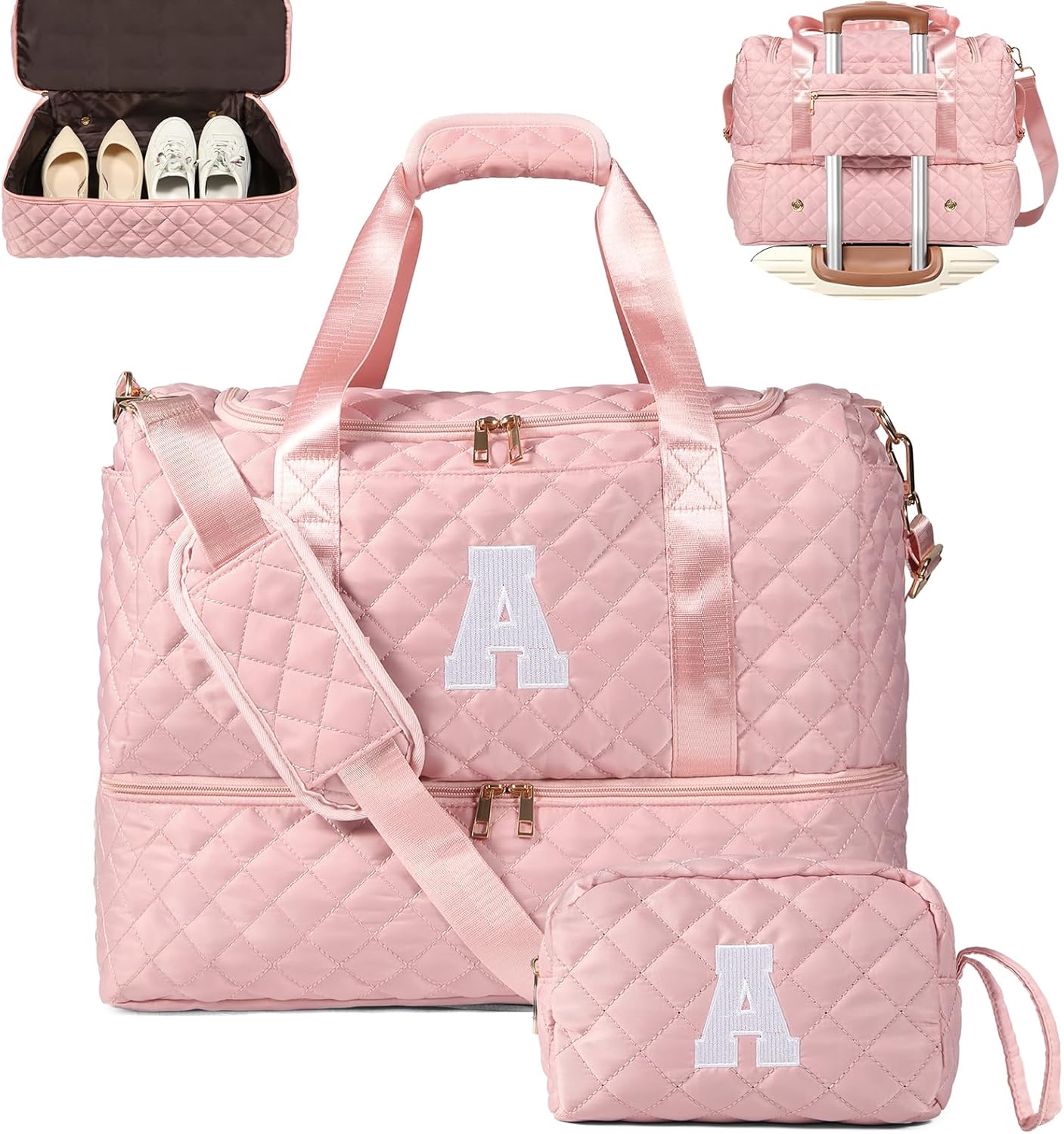 Personalized Initial Travel Bag, Quilted Duffle Bag, Weekender Bag for Women with Cosmetic Bag, Gym Bag with Shoe Compartment, Carry on Overnight Bag, Hospital Bag for Labor Delivery (Pink, A)