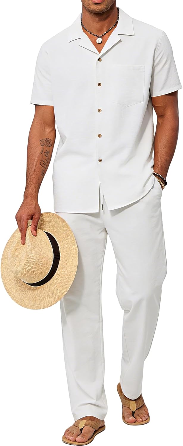 UOUA Mens 2 Piece Outfit Summer Beach Button Down Shirt Casual Loose Pant Sets
