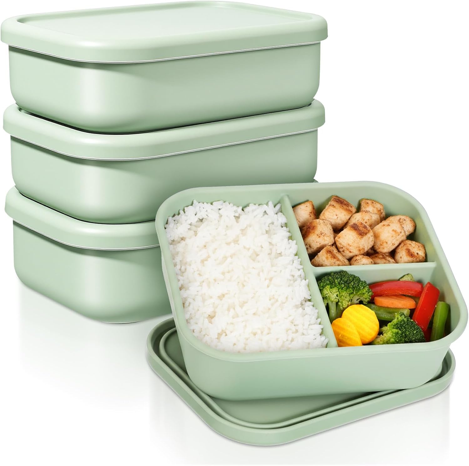 4 Pcs Silicone Bento Box, 3 Compartment Reusable Leakproof Silicone Lunch Container, Microwave & Dishwasher Safe, Small Bento Box for Entree Side Food Snack Storage(Olive Green)