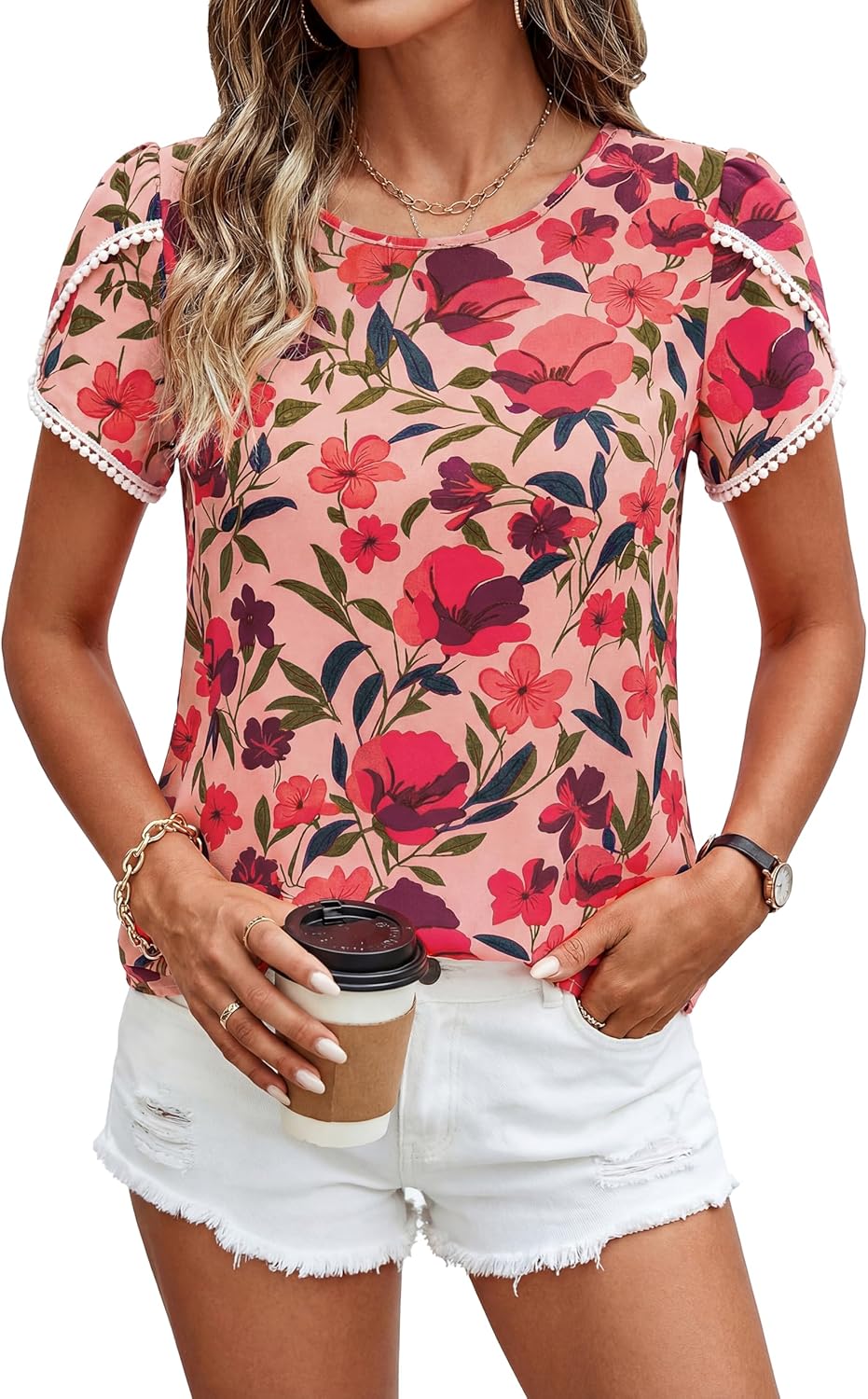 PRETTYGARDEN Womens Spring Tops 2026 Casual Crewneck Lace Crochet Short Sleeve Shirts Floral Boho Blouse Loose Tunic Top