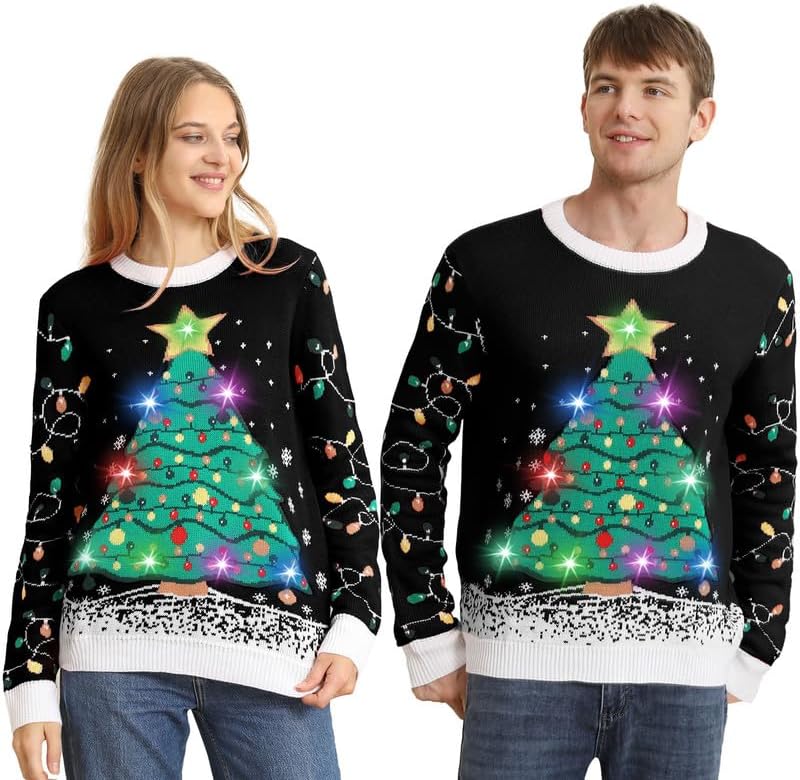 Ugly Christmas Sweaters for Women Men,Light Up Christmas Sweater,Funny Christmas Tree Black Unisex Xmas Sweaters for Couples