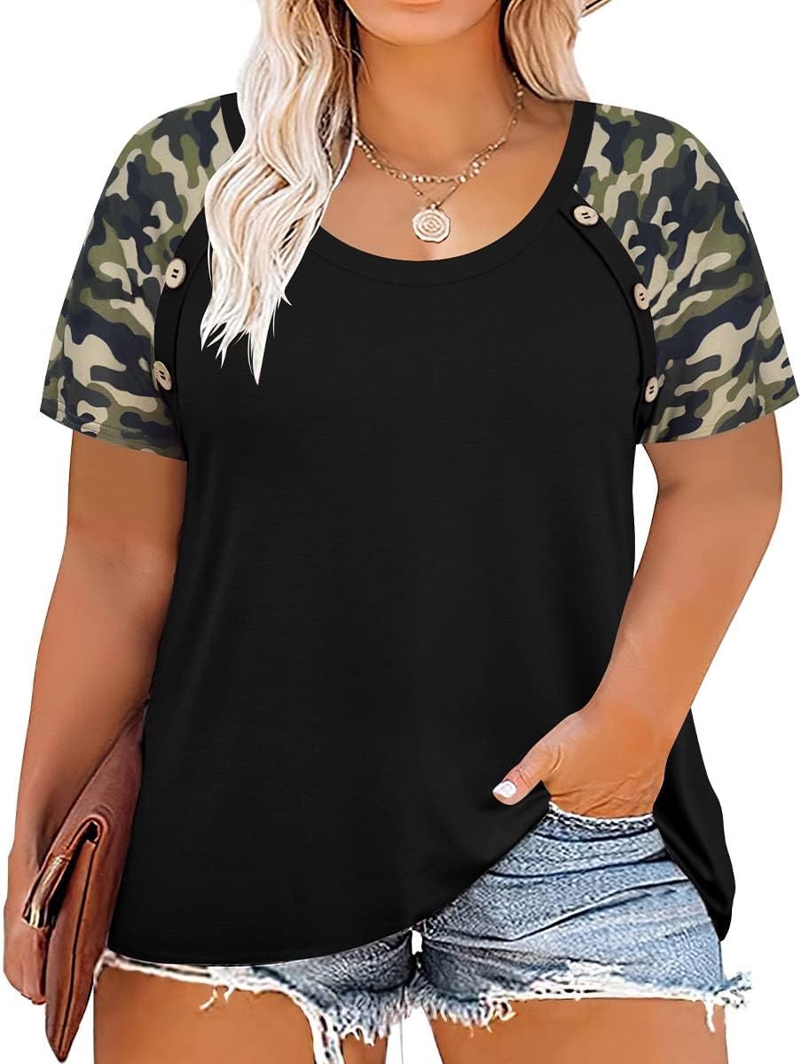 TIYOMI Plus Size T Shirts for Women Camo Raglan Sleeve Short Sleeve Tunic Blouses Fashion Casual Round Neck Black Solid Color Summer Loose Fit Outwear