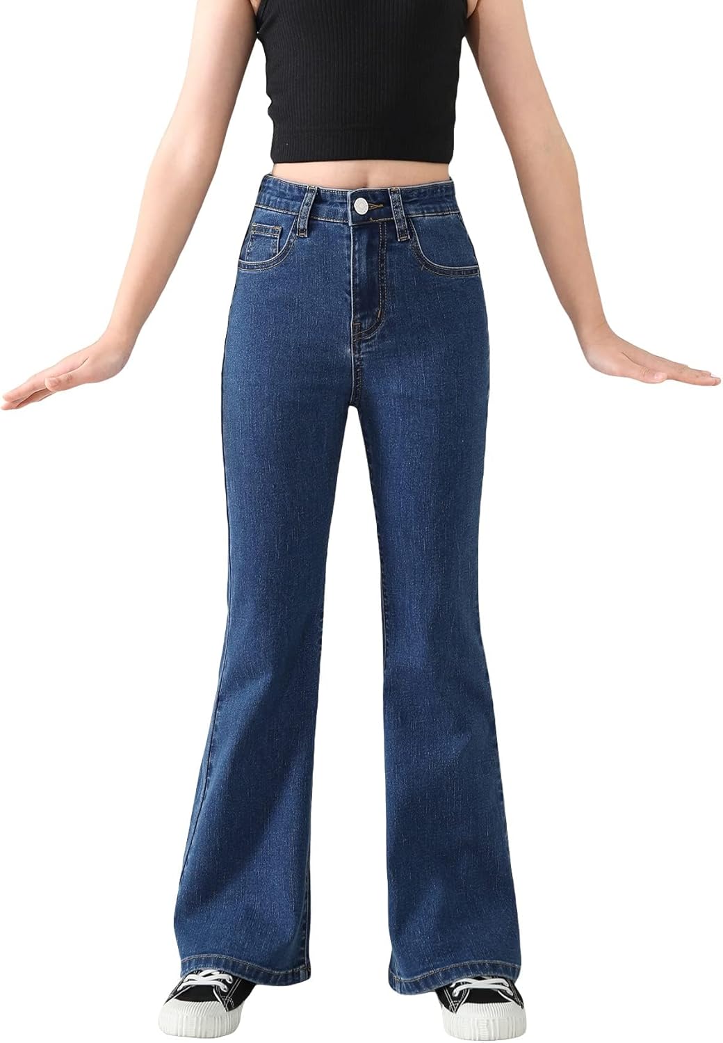Peakpride Girls Jeans Flare High Elastic Waist Denim Pants Bell Bottom Stretch Cute Y2K Streetwear with Pockets 7-14Y