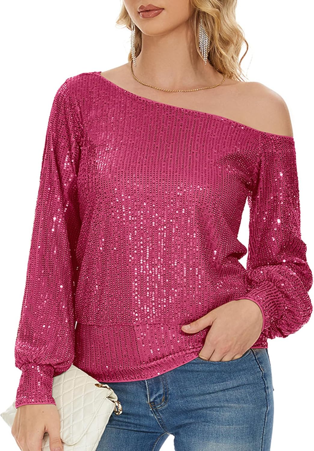 Genhoo Long Sleeve Sequin Tops for Women Off The Shoulder Glitter Sparkly Tops Dressy Party Shirts for Holiday Evening Party