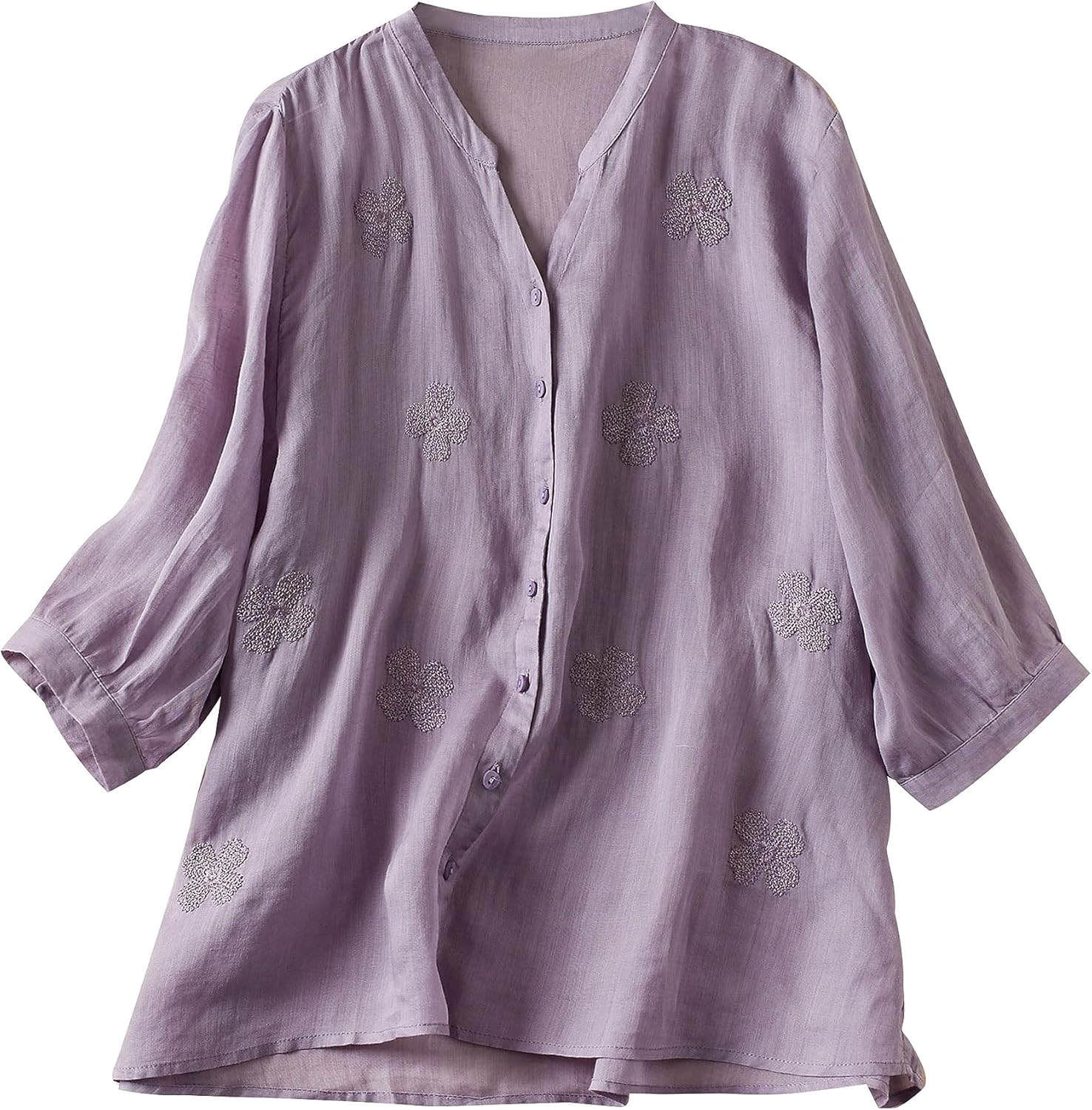 Women's Fall V Neck 3/4 Sleeve Blouses Tops Cotton Linen Jacquard Embroidery Print Tunic Shirts