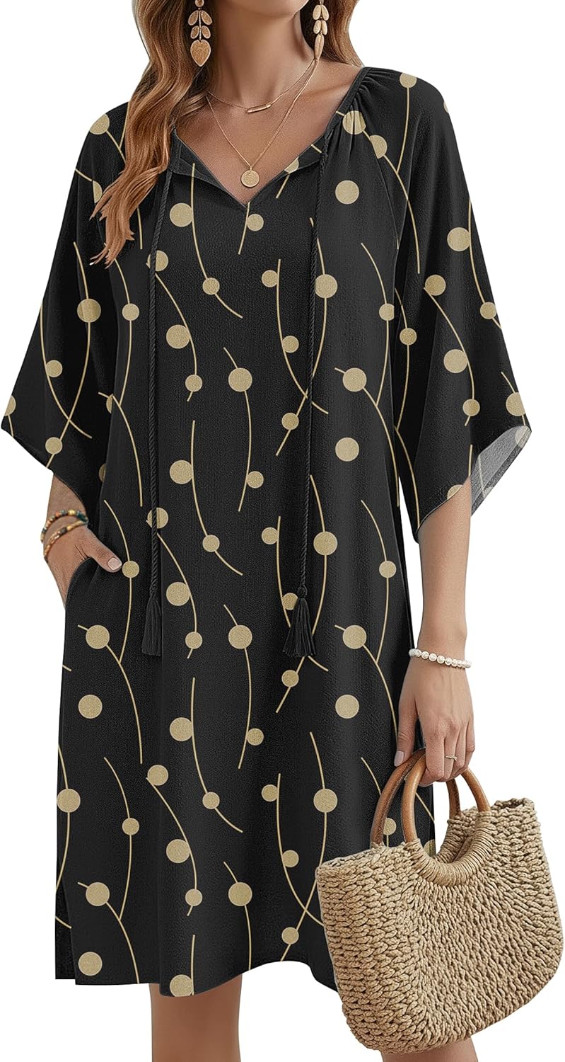 Zeagoo Womens Casual Summer Dress Boho Beach Dresses Tassel Tie Neck 2026 Floral Cover Up Spring 3/4 Sleeve Mini Sundress