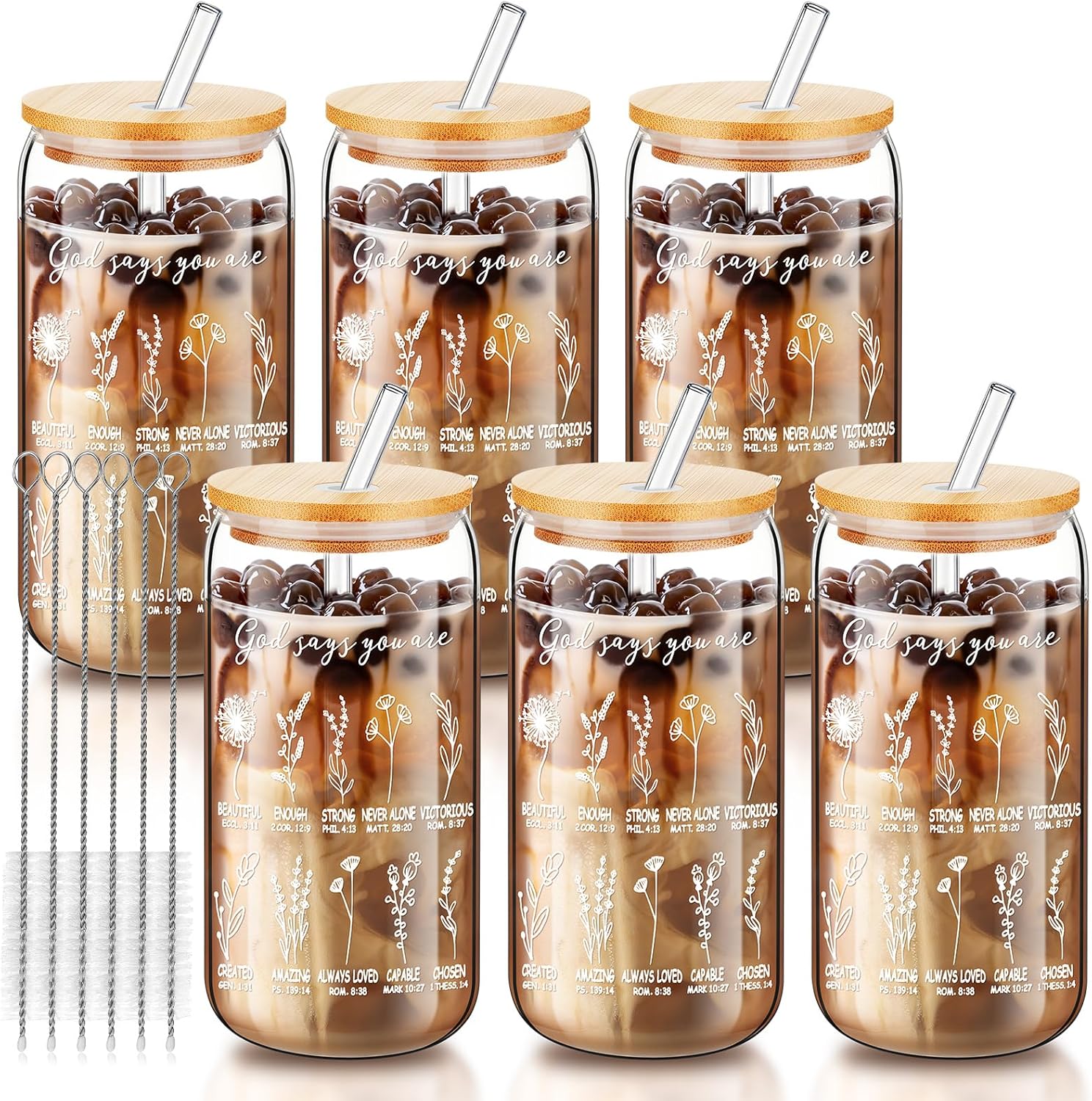 6 Pcs Christian Gifts for Women Christian God Says You Are Glass Tumblers Set 16oz Iced Coffee Cups with Lids Glass Straws Scripture Bible Verse Cups Gifts for Women