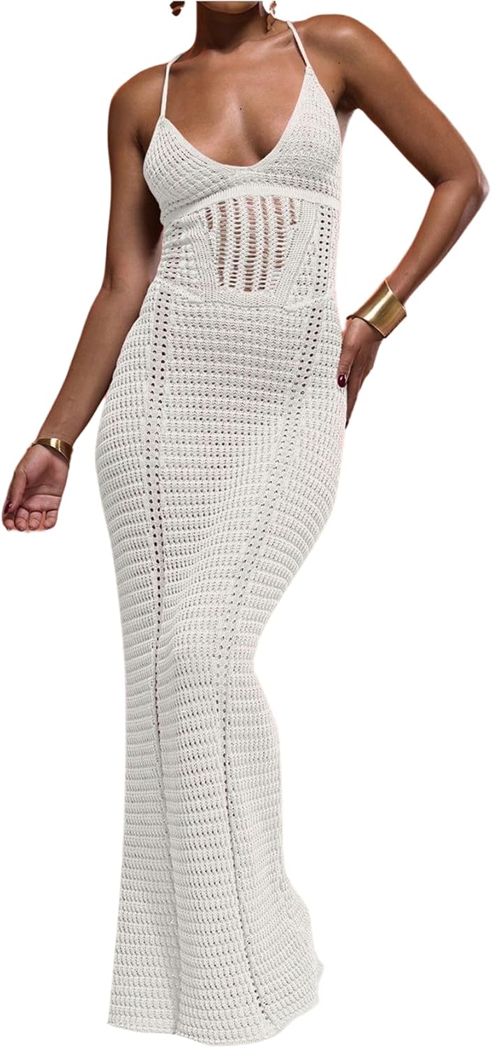 GORGLITTER Women's Crochet Knit Maxi Dress Lace Up Bodycon Beach Cover up Dresses