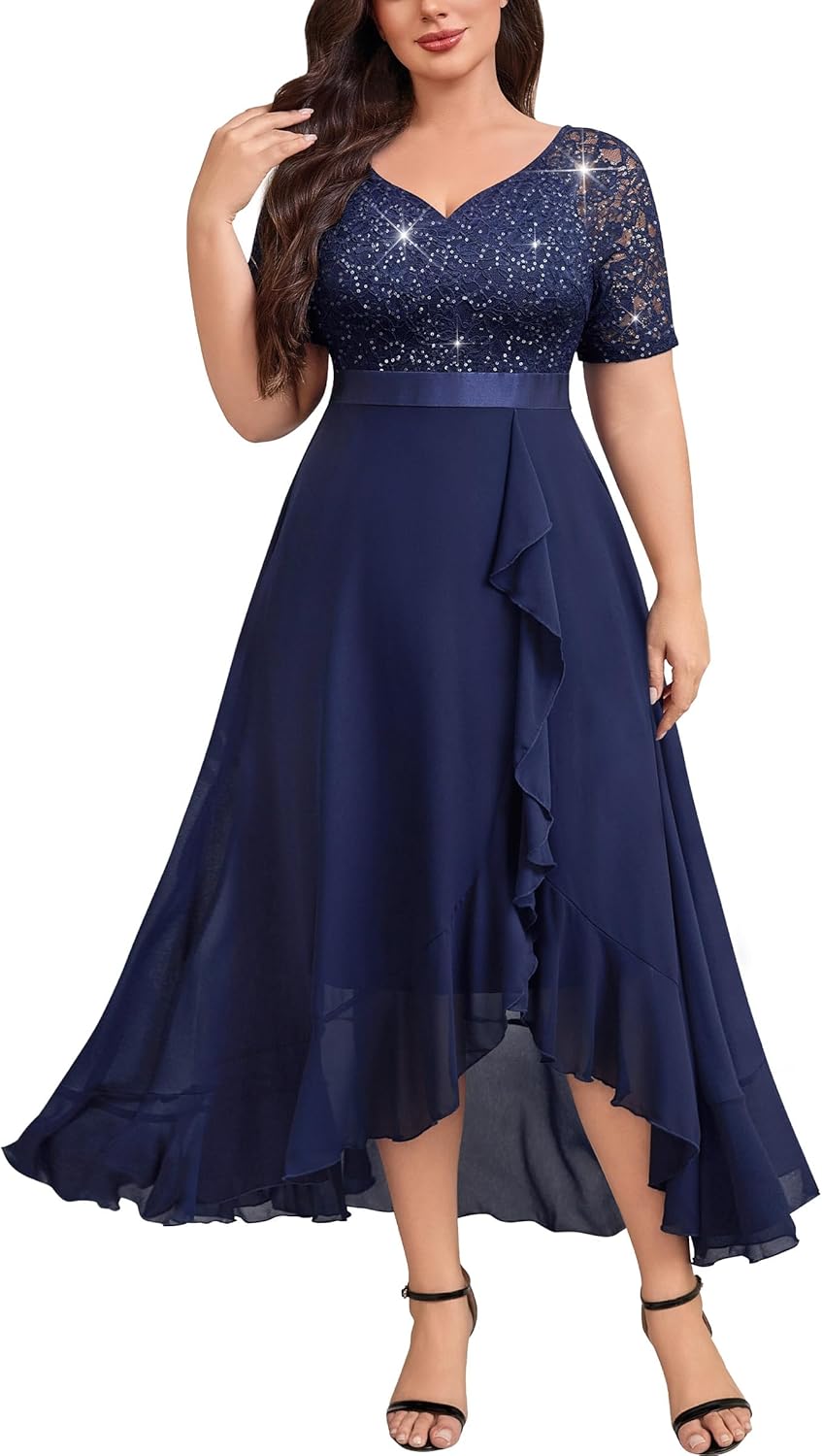 Knitee Women's Plus Size Sequin Lace Sweetheart Neck Ruffled Hemline Formal Evening Maxi Dresses