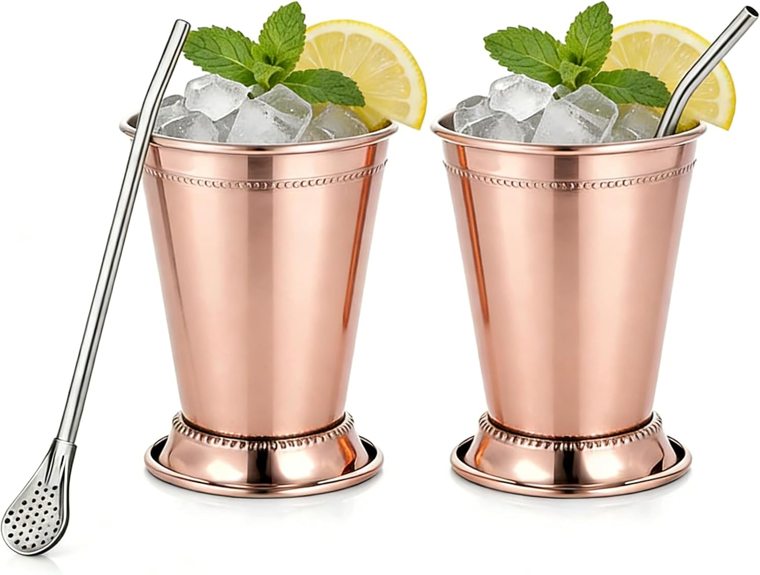 12oz Mint Julep Cups with Straws Set of 2,Stainless Steel Cocktail Glasses Beaded Mint Julep Cup for Mint Julep Cocktails Beer Juice Beverage (2, pink, 500, Milliliters)