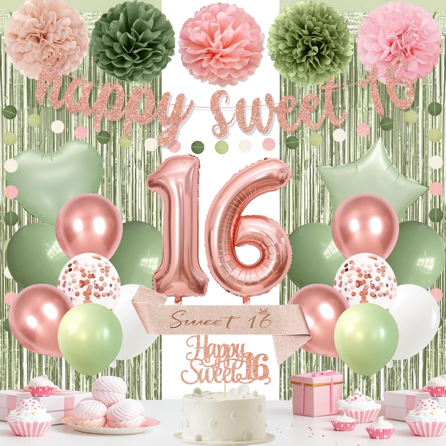 - 【Included items】: 16-year-old pink birthday decoration supplies include 2 sets of bright green metal wire curtains, 1pcs rose gold "Happy Birthday 16" banner, 1pcs pink-green-white polka dot pattern decoration, 1pcs big cake top, 1pcs rose gold 16-year-old birthday Sash, 14pcs 12-inch latex balloons, 1pcs pink 18-inch heart-shaped cream green aluminum film balloon, 1pcs pink 18-inch star-shaped cream green aluminum film balloon, 1pcs pink 32-inch 16-digit aluminum film balloon, 5pcs 10-inch paper flower balls, with glue and ribbons.