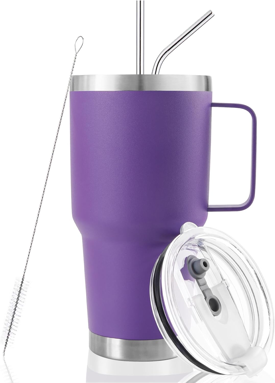 30 oz Tumbler With Handle, Double Wall Stainless Steel Vacuum Insulated Travel Mug with Splash-Proof Lid Metal Straw and Brush (Purple)