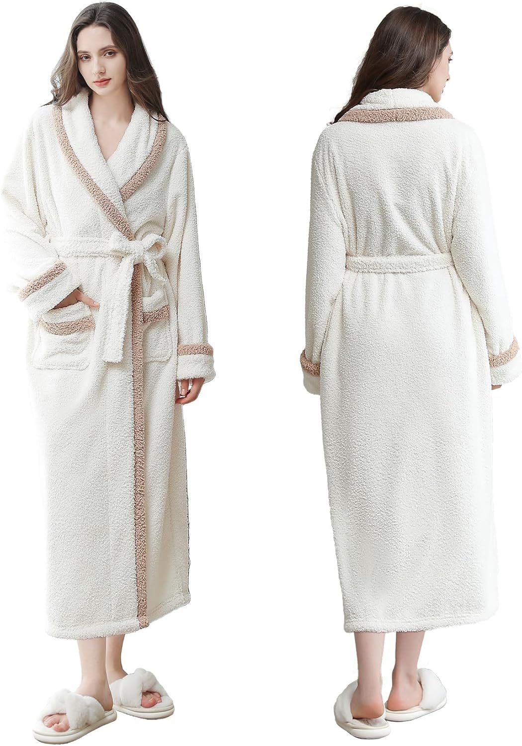 Oksun Womens Long Fleece Robe: Soft Fluffy Warm Bathrobe - Cozy Winter Housecoat Nigthgown with Chic Piping