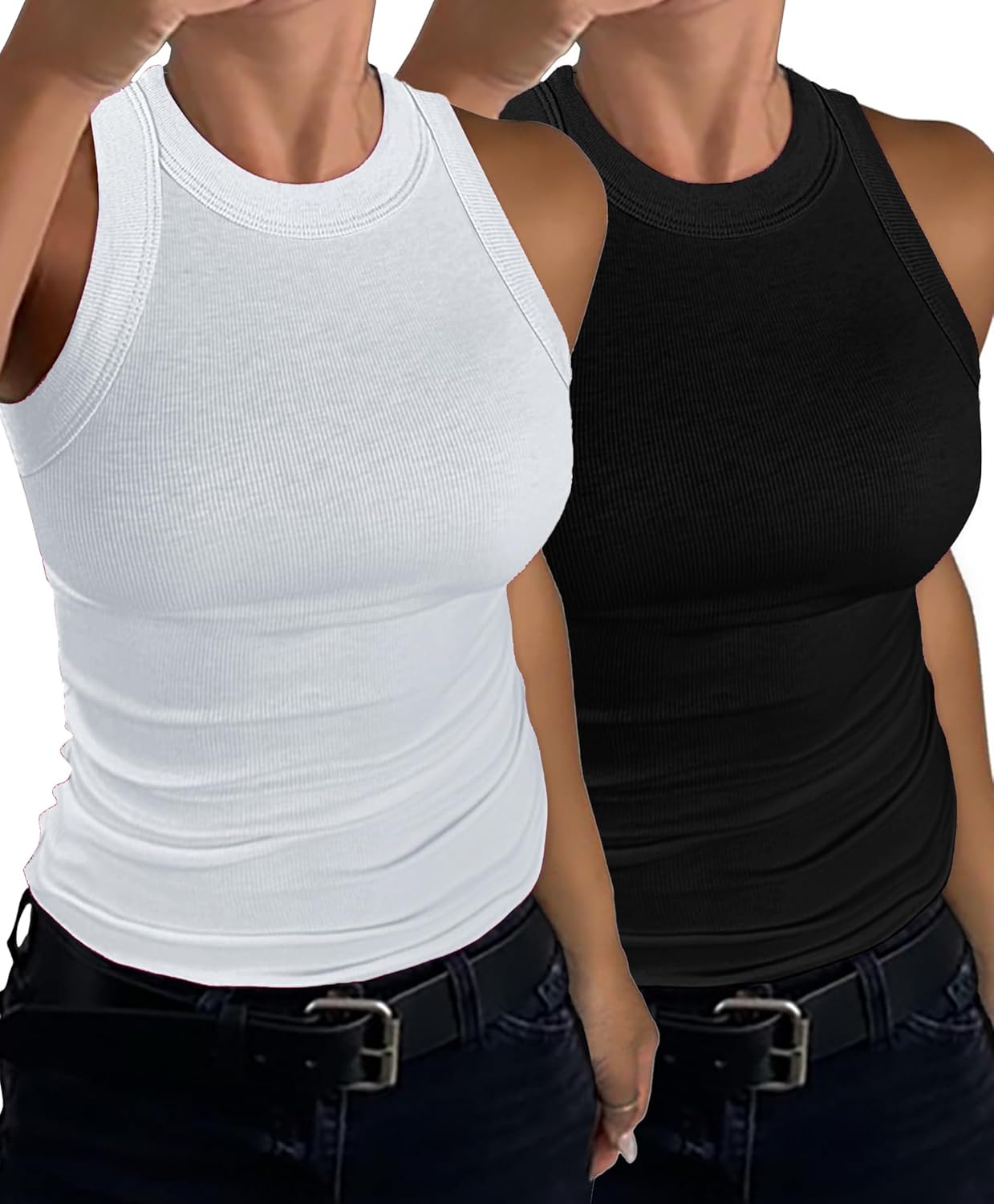 C.O.Z.Y Womens Tank Tops 2 Pack Ribbed Racerback Top Summer High Neck Sleeveless Shirts Slim Fit