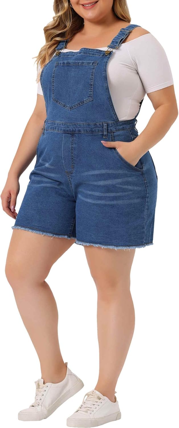Agnes Orinda Plus Size Denim Overall Shorts for Women Raw Hem Adjustable Strap Rompers with Pockets Bib Jeans Shortalls