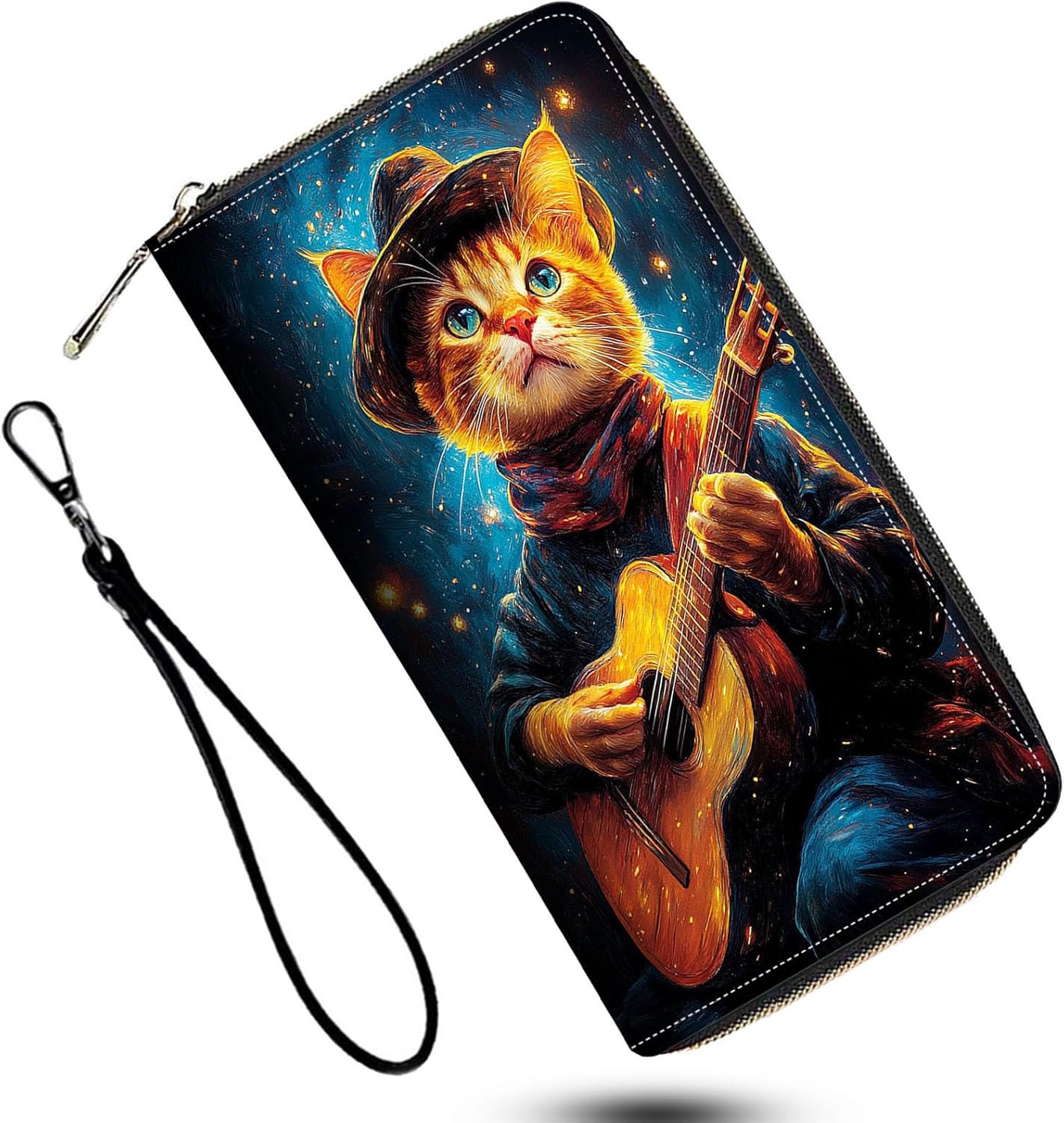Leather Wallet for Women,Large Capacity RFID Blocking Clutch,Zip Around Purse with 24 Card Slots,Bill Compartments Coin Pocket-Cat Playing Guitar
