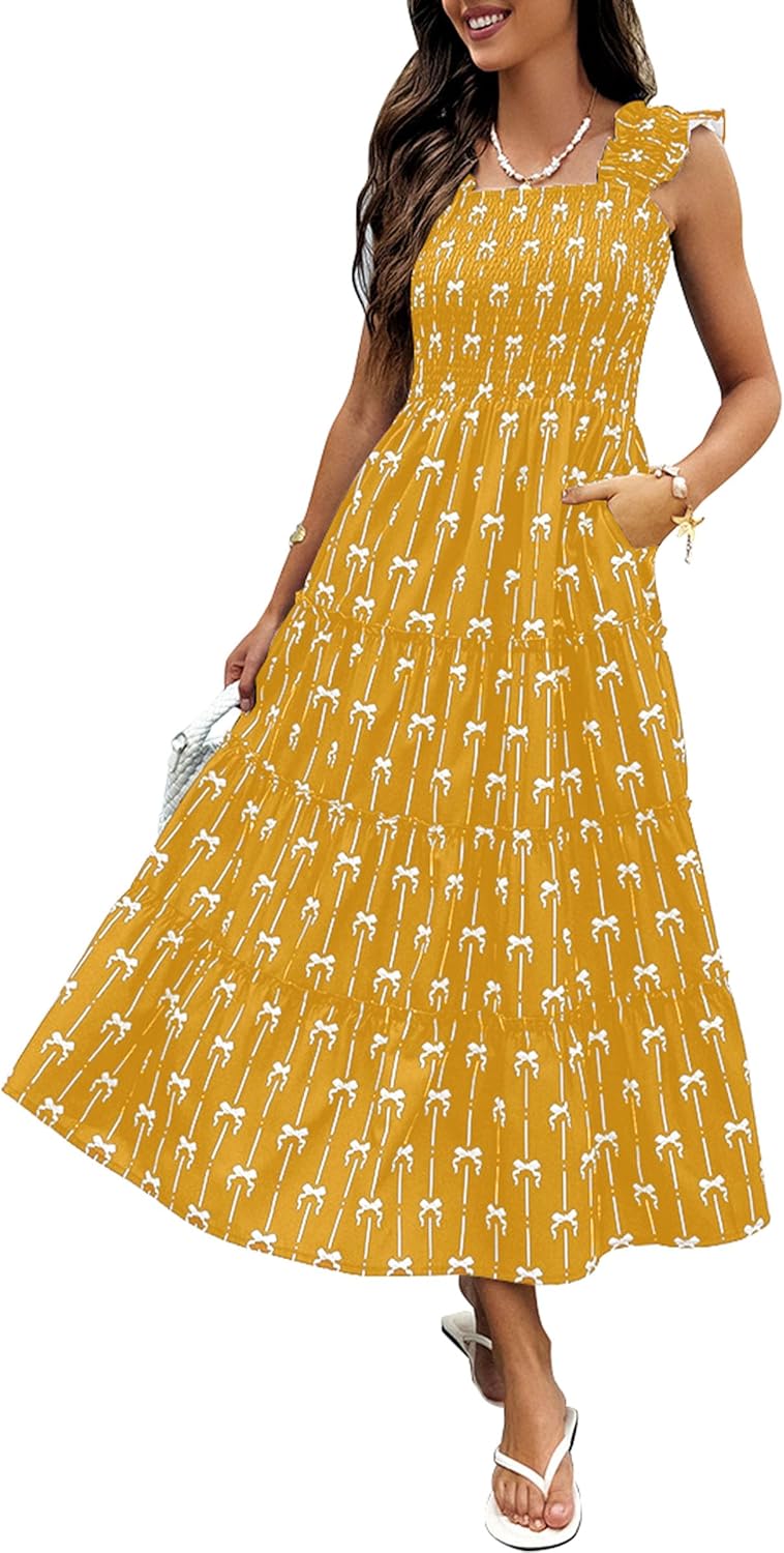 ECOWISH Women's Summer Maxi Dresses - 2026 Sleeveless Square Neck Ruffle Strap Smocked Flowy A Line Beach Vacation Sun Dress