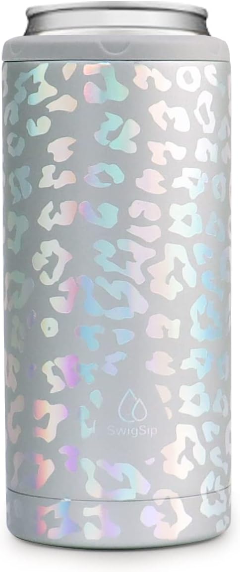 Swig Sip Skinny Can Cooler - Double Wall Stainless Steel Vacuum Insulated Can Holder for 12oz Slim Tall Beverage Bridesmaid Gift (Laser Leopard)